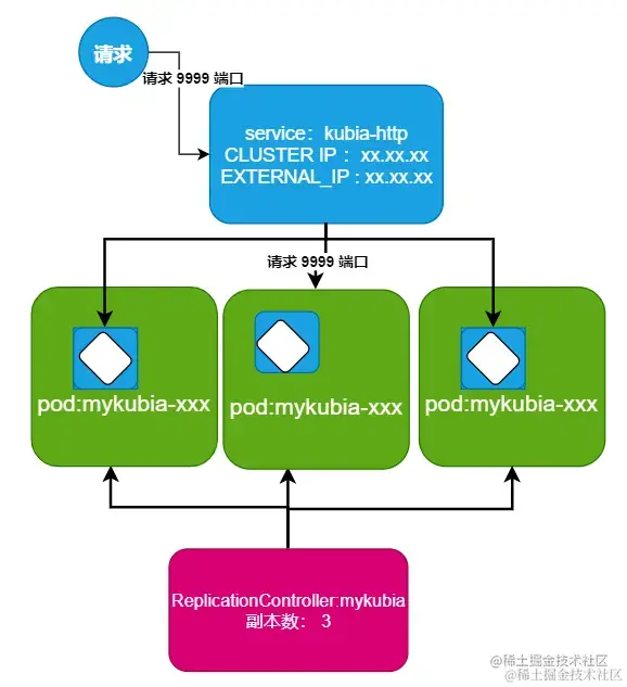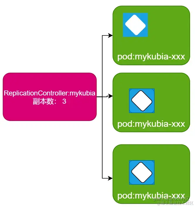 # rc mykubia: Tells K8s to use the ReplicationController we created earlier; rc here is the abbreviation for ReplicationController