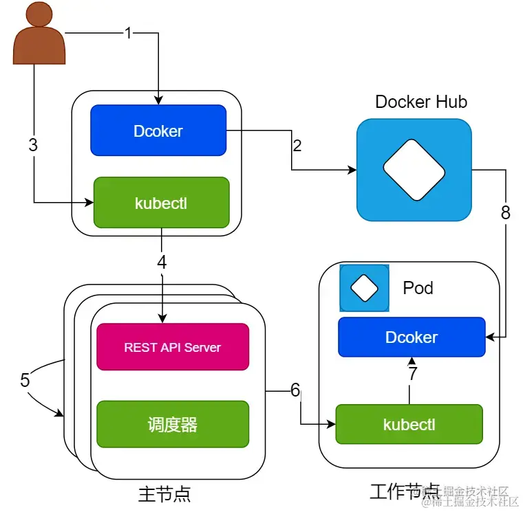 Dockerserver pushes the image toDocker Hub. Kubectlreceives the commandkubectl run mykubia --image=lukia/kubia --port=9999.Kubectlsends a scheduling request to theREST APIserver.- After the master node receives the request, it creates a