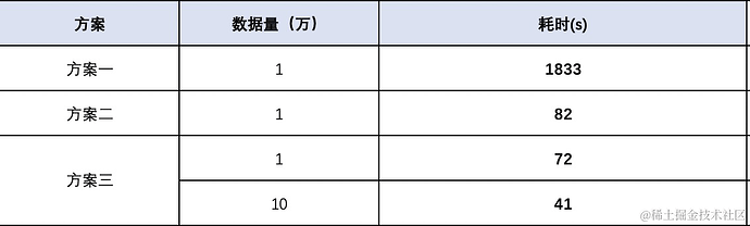 Based on my limited development experience, I have listed three solutions. Solution 1 uses 10,000 test records (to save time), and Solution 3 uses 100,000 test records.