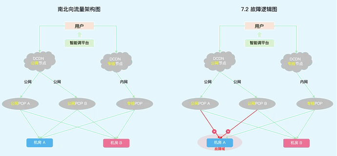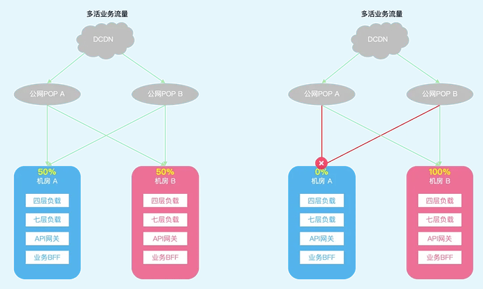 However, in this outage, both POPs connected to Computer Room A failed, which is equivalent to the public network of Computer Room A going offline. Unlike a single POP outage, the conventional mutual disaster recovery scheme between dual POPs cannot take effect. Except for several core service scenarios that were not affected because computer room-level disaster recovery strategies were pre-configured, non-automatically disaster-recovered multi-active services require computer room-level traffic switching to achieve damage mitigation. Since DCDN dedicated line nodes can perform origin pull via the B2-CDN ring network dedicated line and were not affected by this outage, they ultimately became the escape path for non-multi-active services.