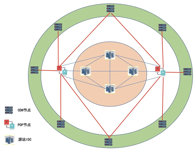 Figure 1: North-south traffic architecture diagram / 0702 outage logic diagram Figure 2: B2-CDN ring network schematic diagramLet us first briefly introduce Bilibili's origin architecture. As can be seen from Figure 1 above, Bilibili's online services have two core computer rooms, each with two Internet access points (public network POP), and these two Internet access points are located in different provinces and cities. The core idea of this design is to decouple network access (collectively referred to as POP below) and computing power centers (collectively referred to as computer rooms below), so as to achieve the effect of disaster recovery for access layer failures.