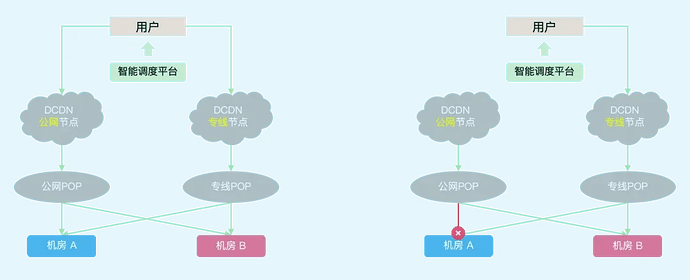 Bilibili's interface requests are mainly accelerated back to the origin via DCDN. DCDN nodes are divided into two types: public network nodes that pull origin via the public network, and dedicated line nodes that pull origin via dedicated lines. Under normal circumstances, DCDN public network nodes can return to the origin through dual public network POPs, while DCDN dedicated line nodes return to the origin through internal network dedicated lines. At the DCDN level, there is a Health Check function for origin servers, which automatically removes origin IPs that fail probes. For example, when a DCDN node's origin request to POP A encounters an exception, it will retry to POP B. Under normal operation, DCDN public network nodes perform cross-origin pull via dual POPs, which can handle packet loss or outages at one origin POP, and the disaster recovery scheme takes effect automatically with almost no impact on services.