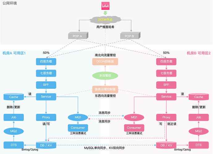 Figure 4: Schematic diagram of same-city multi-active architectureCurrently, our station's services mainly adopt a same-city multi-active architecture. As shown in Figure 4, we logically divide multiple computer rooms into two availability zones, each of which bears 50% of the traffic under normal operation. If we divide the overall multi-active architecture into layers: