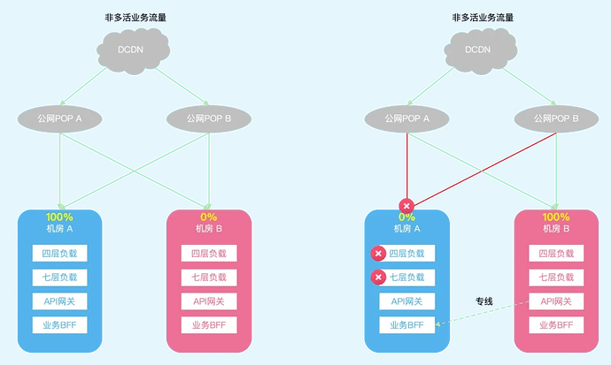 Some services are currently not deployed in a multi-computer room multi-active architecture, and can only handle traffic in one computer room. Therefore, in the original scheme, this part of non-multi-active service traffic can only pull origin to Computer Room A, and cannot handle failures of the public network entrance of Computer Room A. Just like in this outage, non-multi-active service traffic could not be switched for damage mitigation, and had to rely on degradation to route through CDN dedicated line nodes.