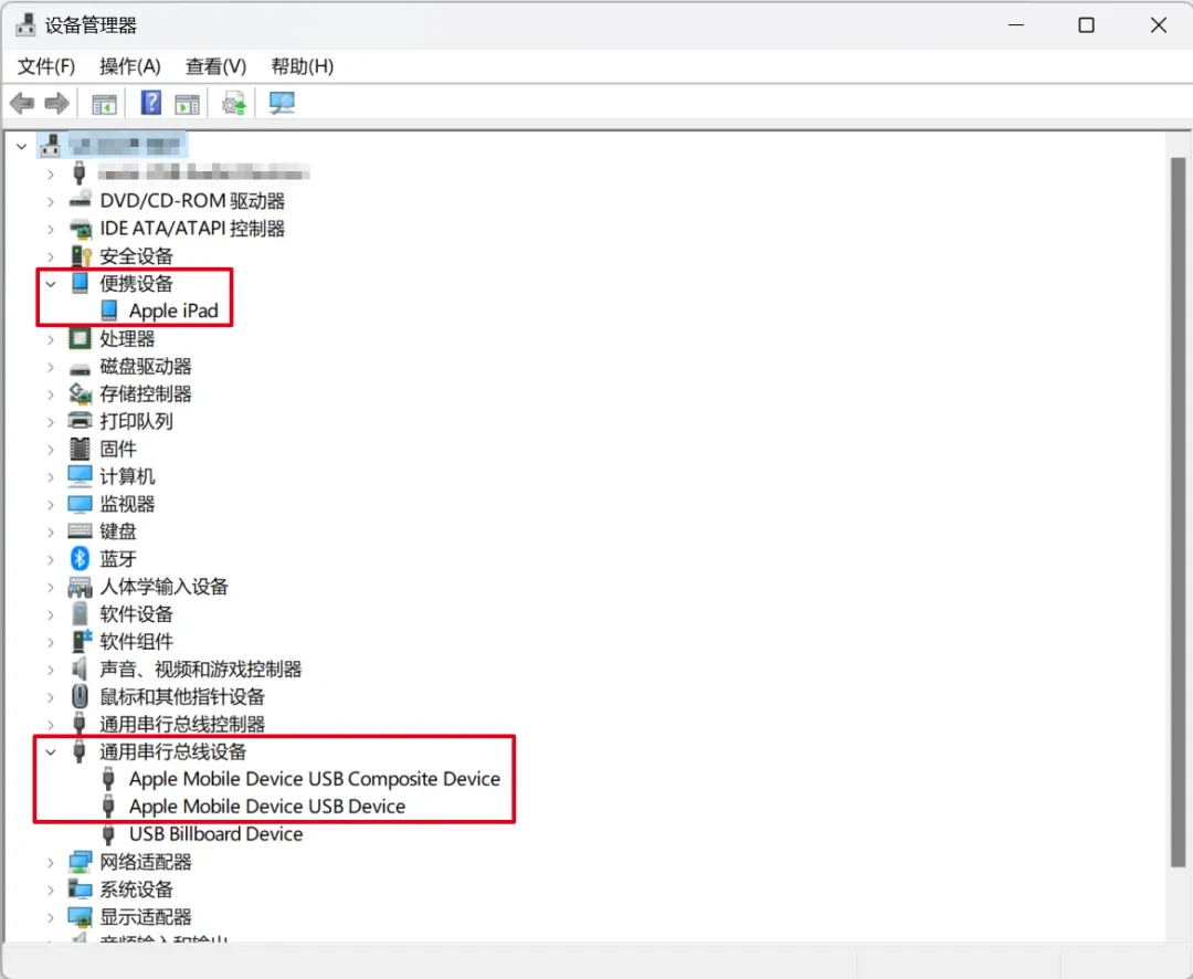 在第一次连接iOS设备时,Windows计算机会为其安装合适的驱动程序。设备管理器中会显示详细的设备信息。
