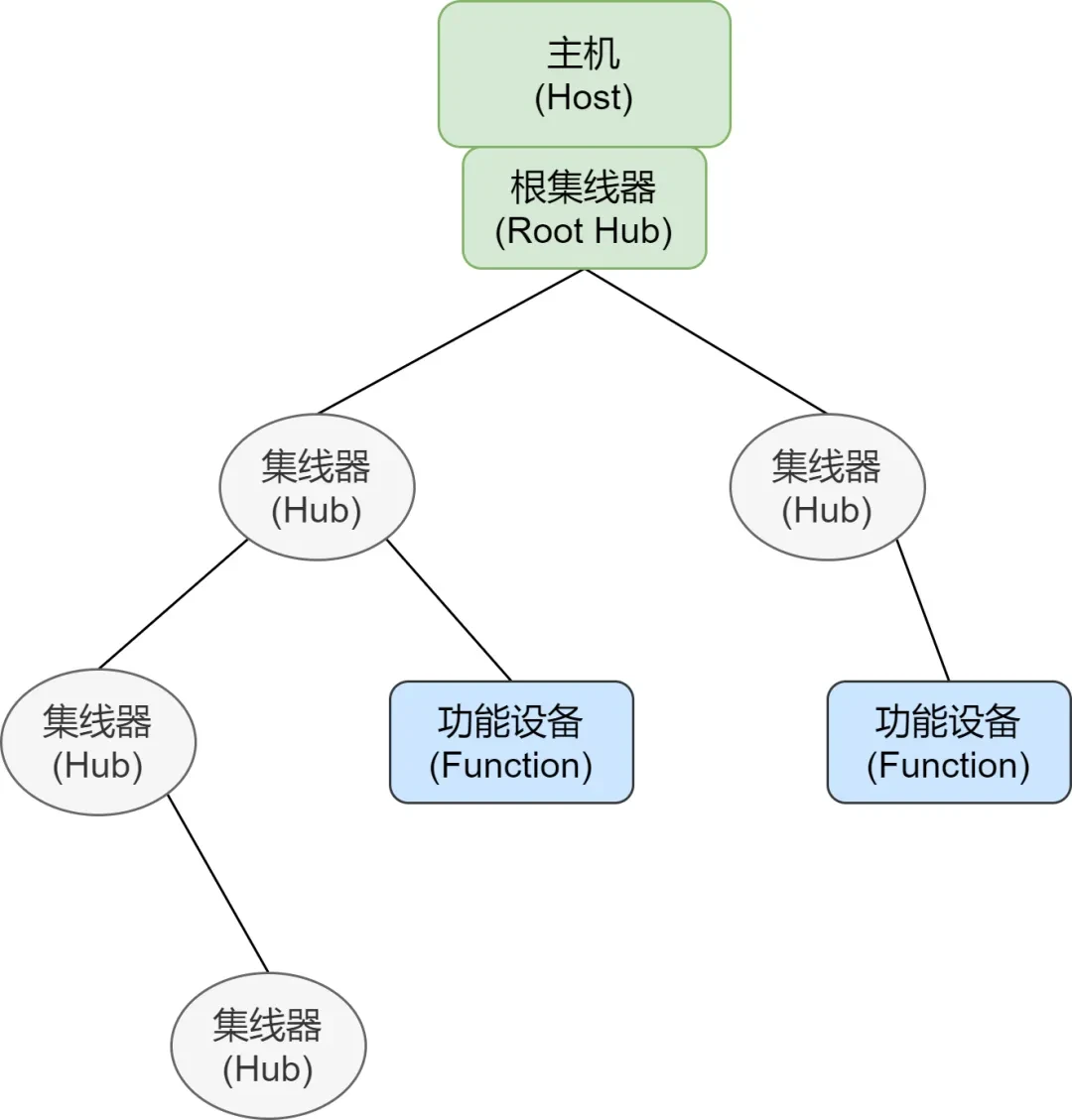 在讲述具体的内容之前,有必要先了解一下USB设备相关的一些基础知识。USB(通用串行总线)是一种用于设备与设备之间互连的串行总线标准 [1]。其总线拓扑如下图所示: