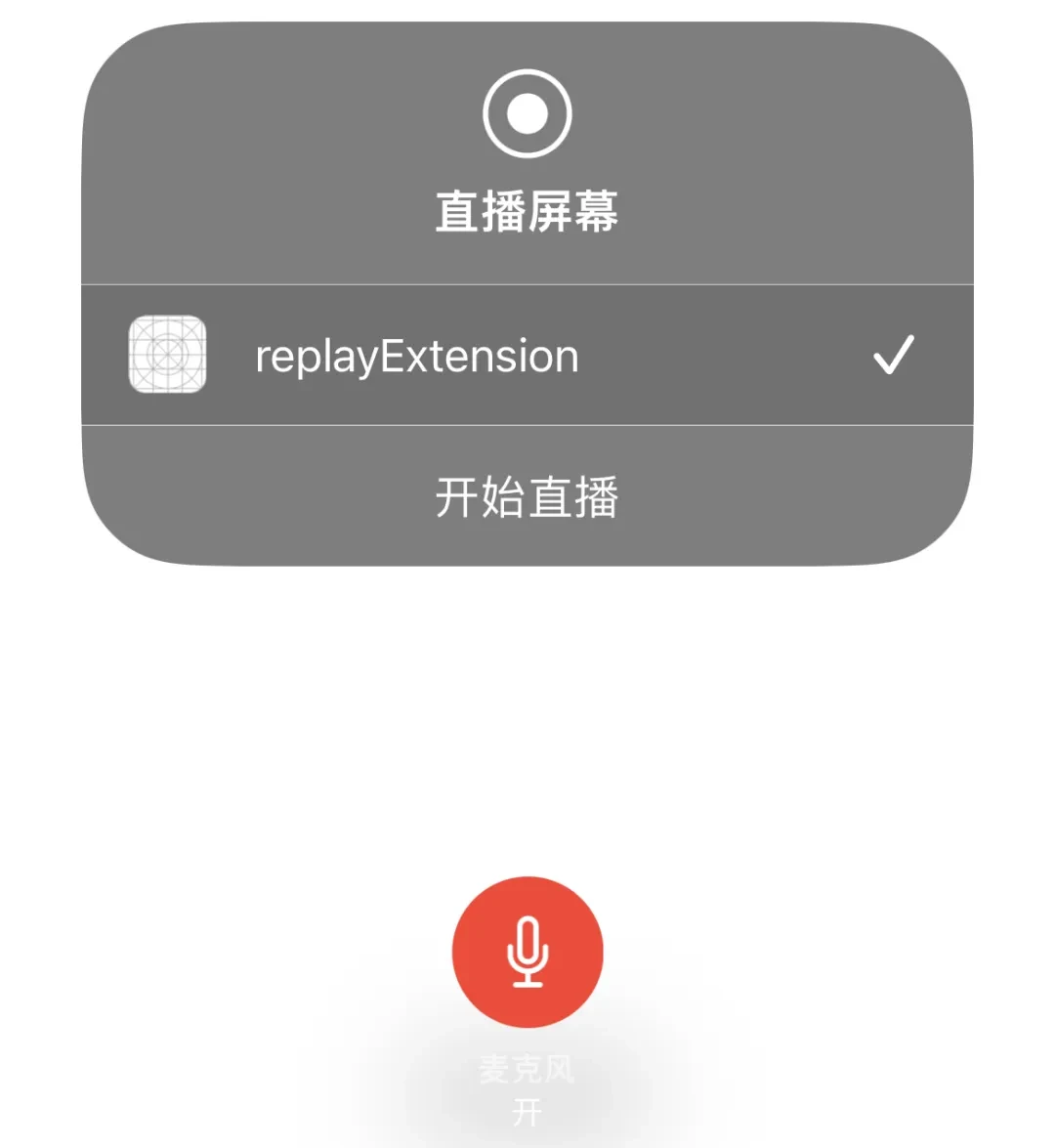 图3-5 iOS录制工程2)通过RPSystemBroadcastPickerView启动屏幕录制页面,或者设置→控制中心→添加屏幕录制,在控制面板长按屏幕录制按钮启动页面: