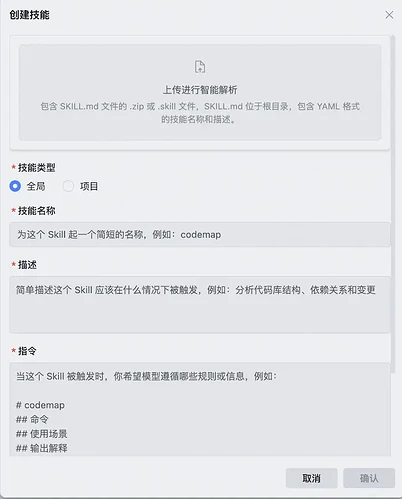 You can fill in the Skill content in this window, or upload an existing Skill file. I chose to upload, and after completion, you can see that the frontend-design skill already appears in the list.