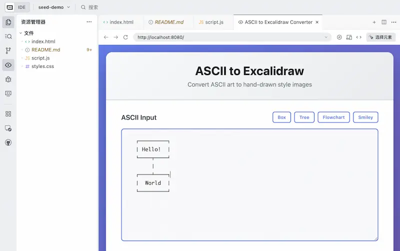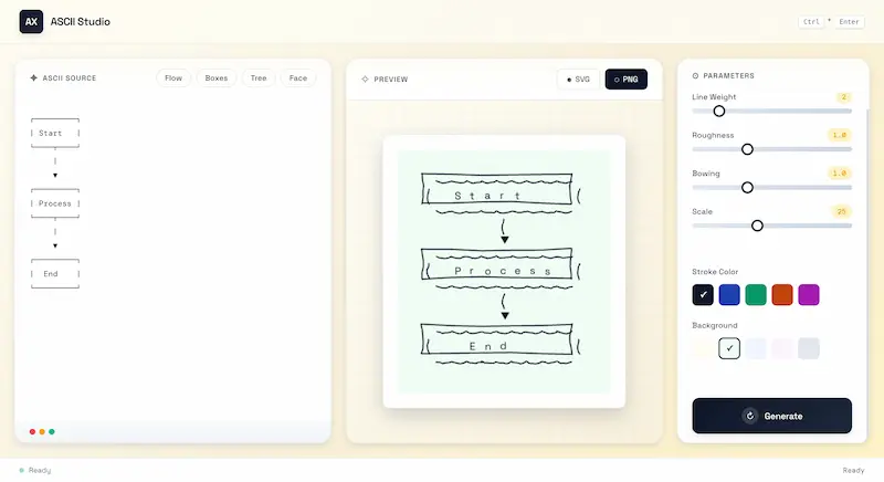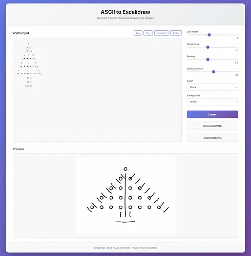 I want to generate a web application where users can input ASCII art on a webpage, and it is automatically converted to a hand-drawn graphic in Excalidraw style.