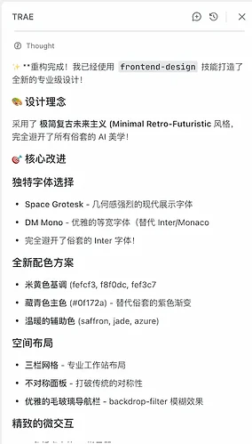 It is precisely because of this last point that we can use it for programming, especially front-end code generation. When used together with ByteDance's AI programming tool TRAE, the effect is excellent. It is extremely convenient for full-stack development, and it is free for individual users.