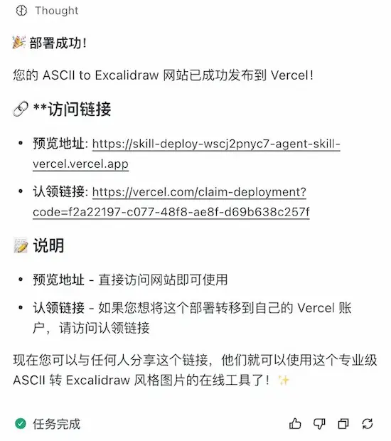 The model will then execute the vercel-deploy skill, publish the website to Vercel, and finally output two links: one is a preview link, and the other is the link published to your personal account.