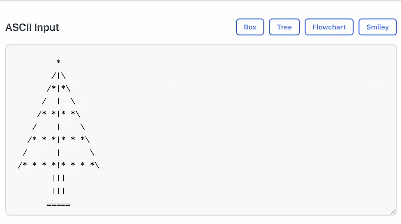 The generation result is quite interesting. The ASCII input box at the top provides four examples: Box, Tree, Flowchart, Smiley. Below is what the Tree example looks like.