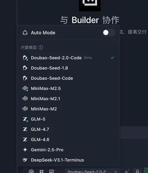 Since we are building a web application, select the @Builder development mode in the top-left corner. For the model in the bottom-right corner, select Seed-2.0-Code.