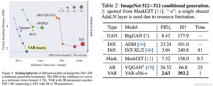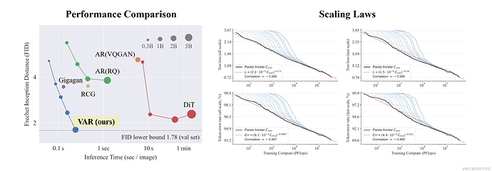 - Better Scaling Capability: As shown in the left image, large DiT models show saturation after scaling to 3B and 7B parameters, and cannot get closer to the FID lower bound; while VAR's performance continues to improve as it scales to 2 billion parameters, finally reaching the FID lower bound