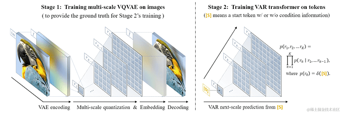 VAR trains a multi-scale quantized autoencoder (Multi-scale VQVAE) in the first stage, and trains an autoregressive Transformer consistent with the GPT-2 architecture (combined with AdaLN) in the second stage.