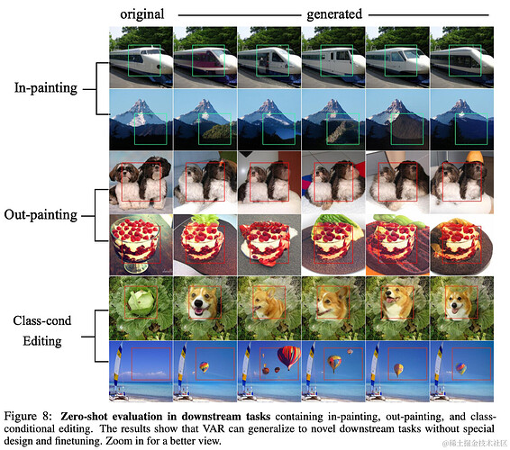 Thanks to the excellent property of autoregressive models that they can use the Teacher-forcing mechanism to forcibly keep some tokens unchanged, VAR also exhibits certain zero-shot task generalization capabilities. The VAR Transformer trained on conditional generation tasks can zero-shot generalize to some generative tasks without any fine-tuning, such as image inpainting, image outpainting, and class-condition editing, and achieves certain results: