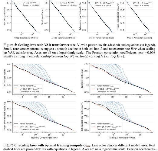 Through experiments, the researchers observed that VAR exhibits a power-law Scaling Law almost identical to that of LLMs: the researchers trained 12 models of different sizes, scaling the parameter count from 18 million to 2 billion, with total computational volume spanning 6 orders of magnitude, and the maximum total token count reaching 305 billion. They observed a smooth power-law relationship between test set loss L or test set error rate and N, as well as between L and Cmin, with good fitting results: